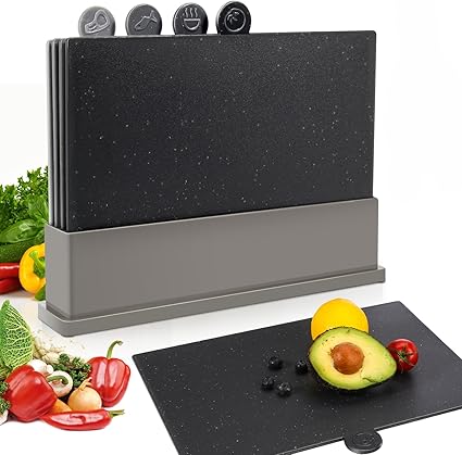 About this item Set of 4 Mats: This cutting board set consists of 4 pc thick cutting boards made from food grade PP.Each board is designed for cutting a specific group of foods,equipped with a patterned tag. You can easily classify ingredients to effectively avoid cross-contamination between different foods. Color Index Cutting Boards:Each cut mat has a color-coded food icon and indexable labels indicating which type of food should be used – raw meat, raw fish, vegetables or cooked food.Colorful cutting boards with different icons help you make faster choices. Convenient Storage: The cutting board can be placed in a matching storage box to save space. The non-slip legs at the bottom of the bracket are perforated and drained so that the cutting board can be drained and kept dry and clean. Easy to Clean: Rinse the surface with water after using so that food scraps and juice can easily wash not adhesion on the surface of cutting board, dishwasher safe. Durable: Special compression process makes the cutting board more compact and more durable than other plastic cutting boards. Highly resistant to deformation and abrasion and will not expand over time.